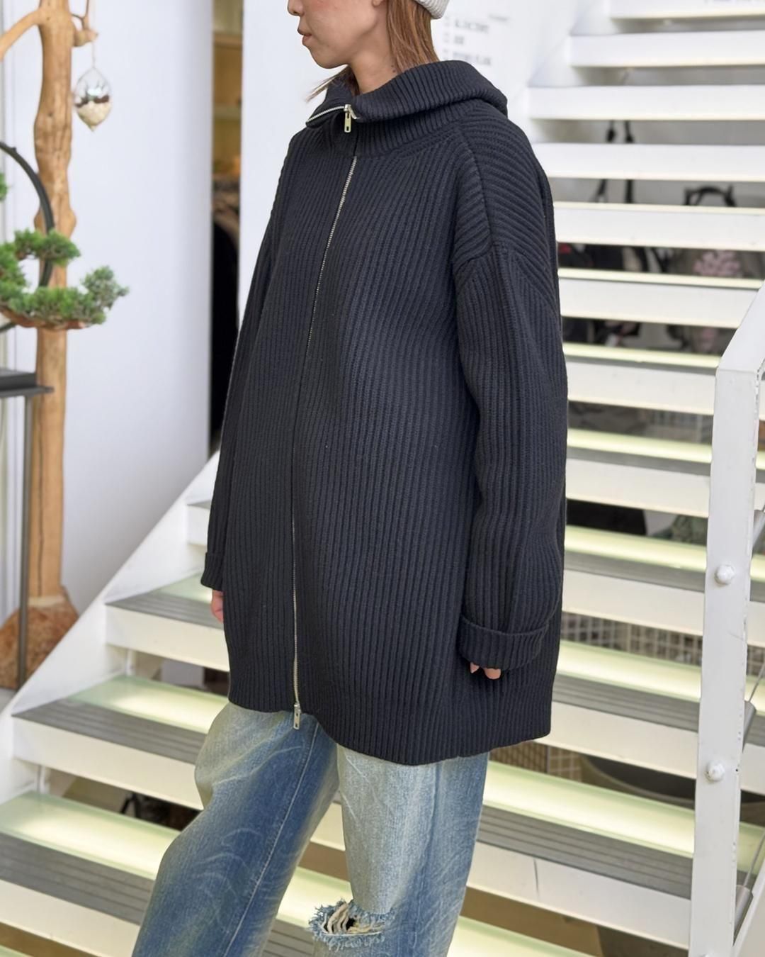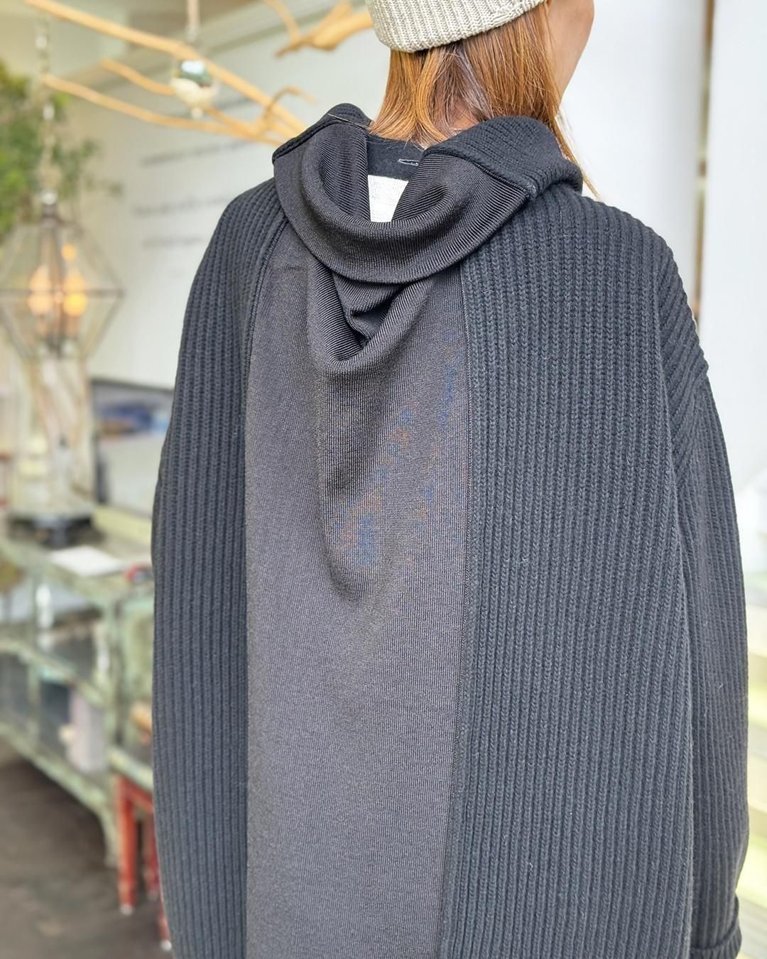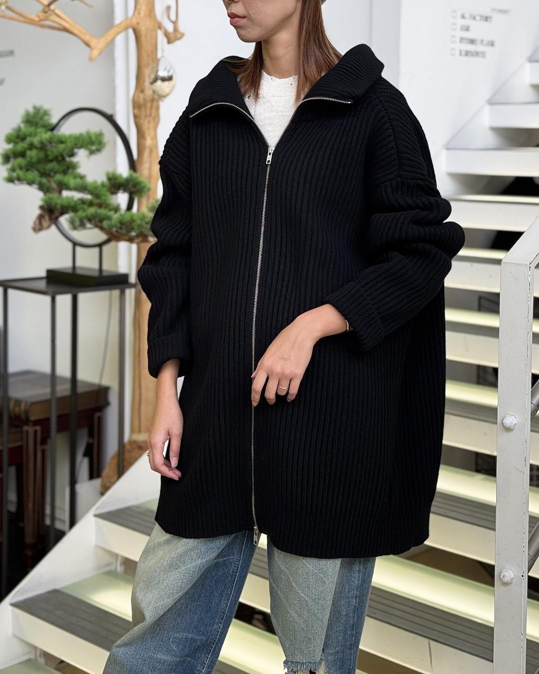 オーバーサイズシルエットのジップアップセータードレス。バックに折りたたみ式のインサートパネルを備え、広げることでシルエットがさらに強調されます。リラックスしたフィット感、ドロップショルダー、流れるようなドレープが特徴で、ニットウェアを静かに再解釈しています。 バックには1本の白いステッチラインが施されています。