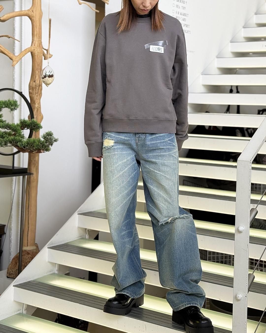 コットンフリース製のスウェットシャツ。胸元には、テープで貼られたようなメゾンの「ニューメリックロゴ」パッチがあしらわれ、MM6のアーカイブに着想を得た遊び心を感じさせます。ドロップショルダーと幅広のリブが、リラックスしたプロポーションを強調。バックには1本の白いステッチがあしらわれ、さりげなくブランドのシグネチャーを示しています。