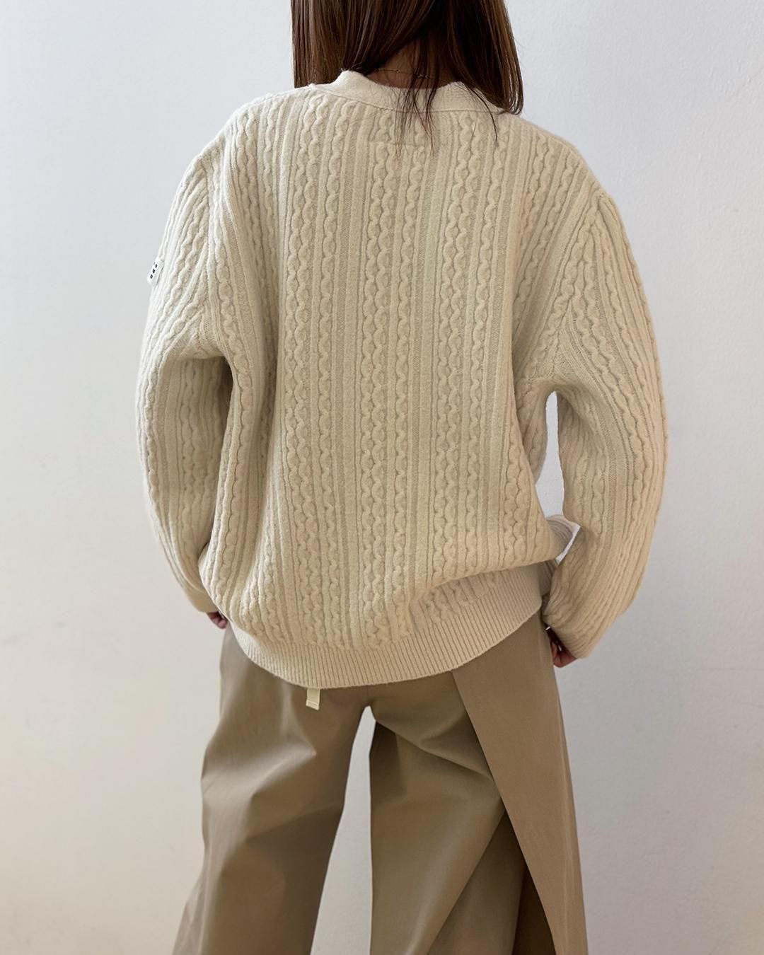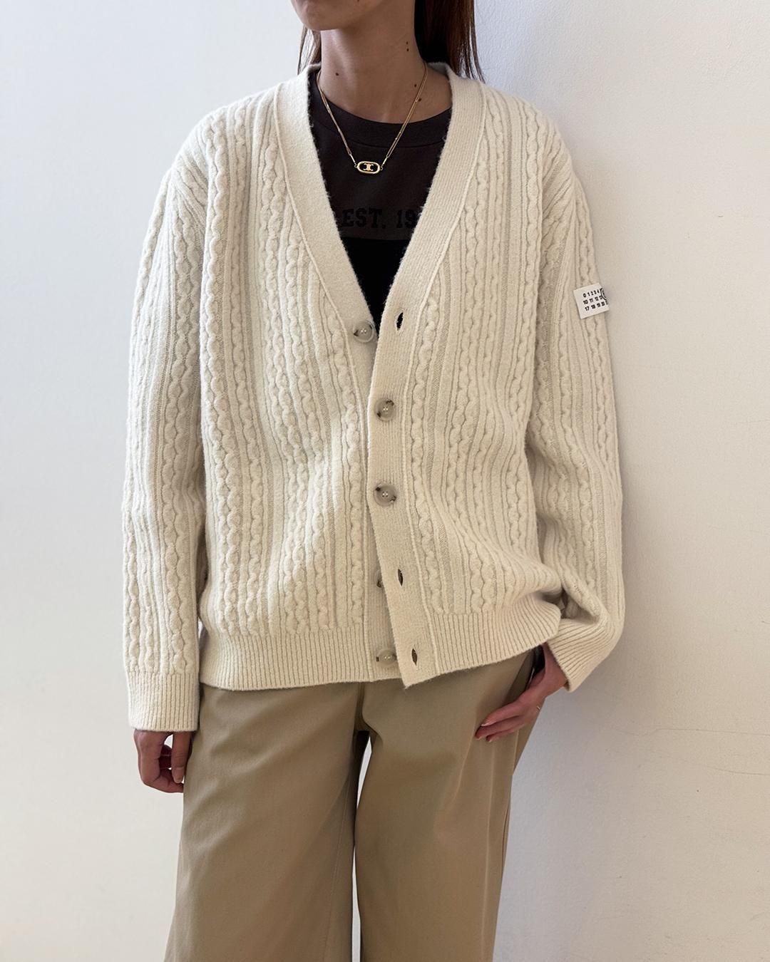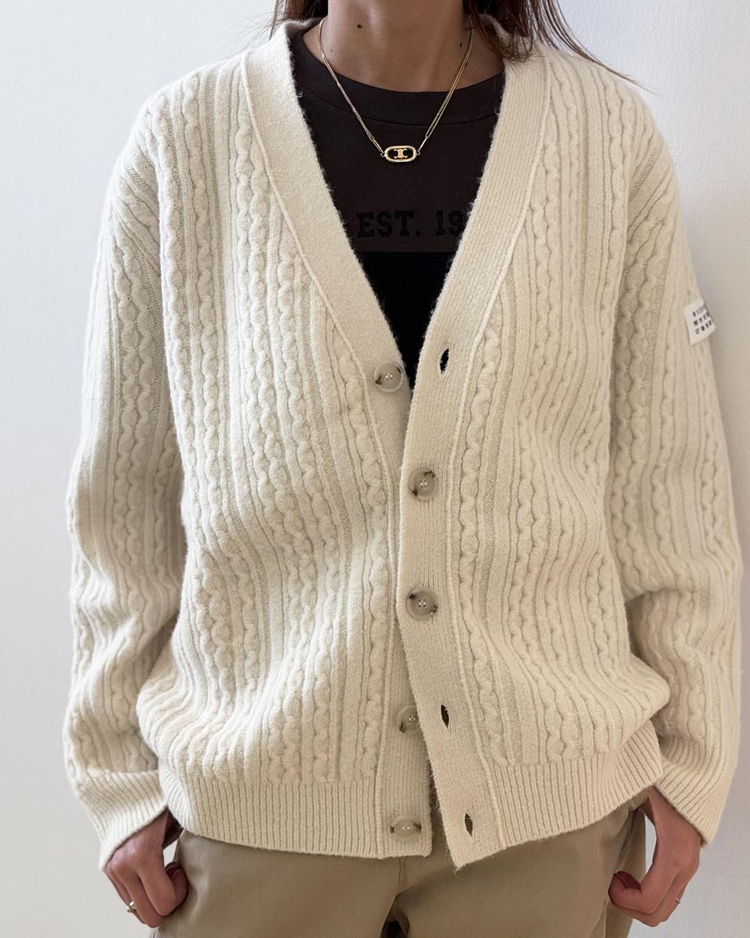 クラシックなニットウェアをソフトに再解釈したケーブル編みのカーディガン。リラックスしたシルエットで、ドロップショルダーとリブの裾が抜け感を演出します。同系色のボタンとVネックで洗練された印象を添え、袖には「ニューメリックロゴ」があしらわれています。