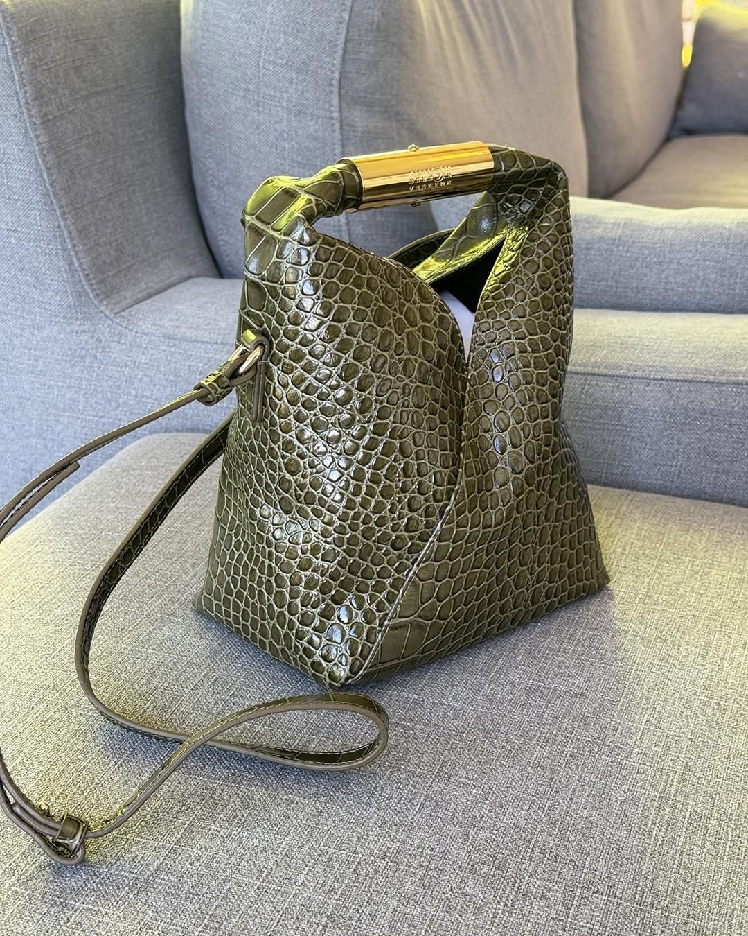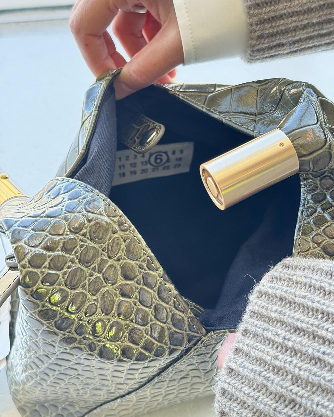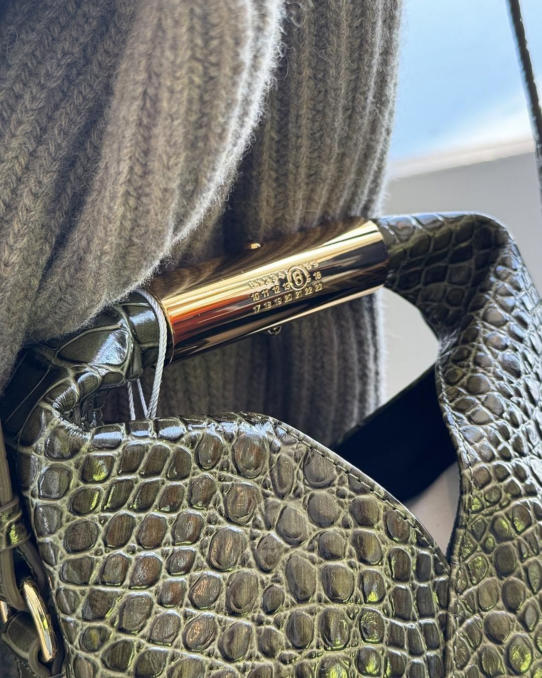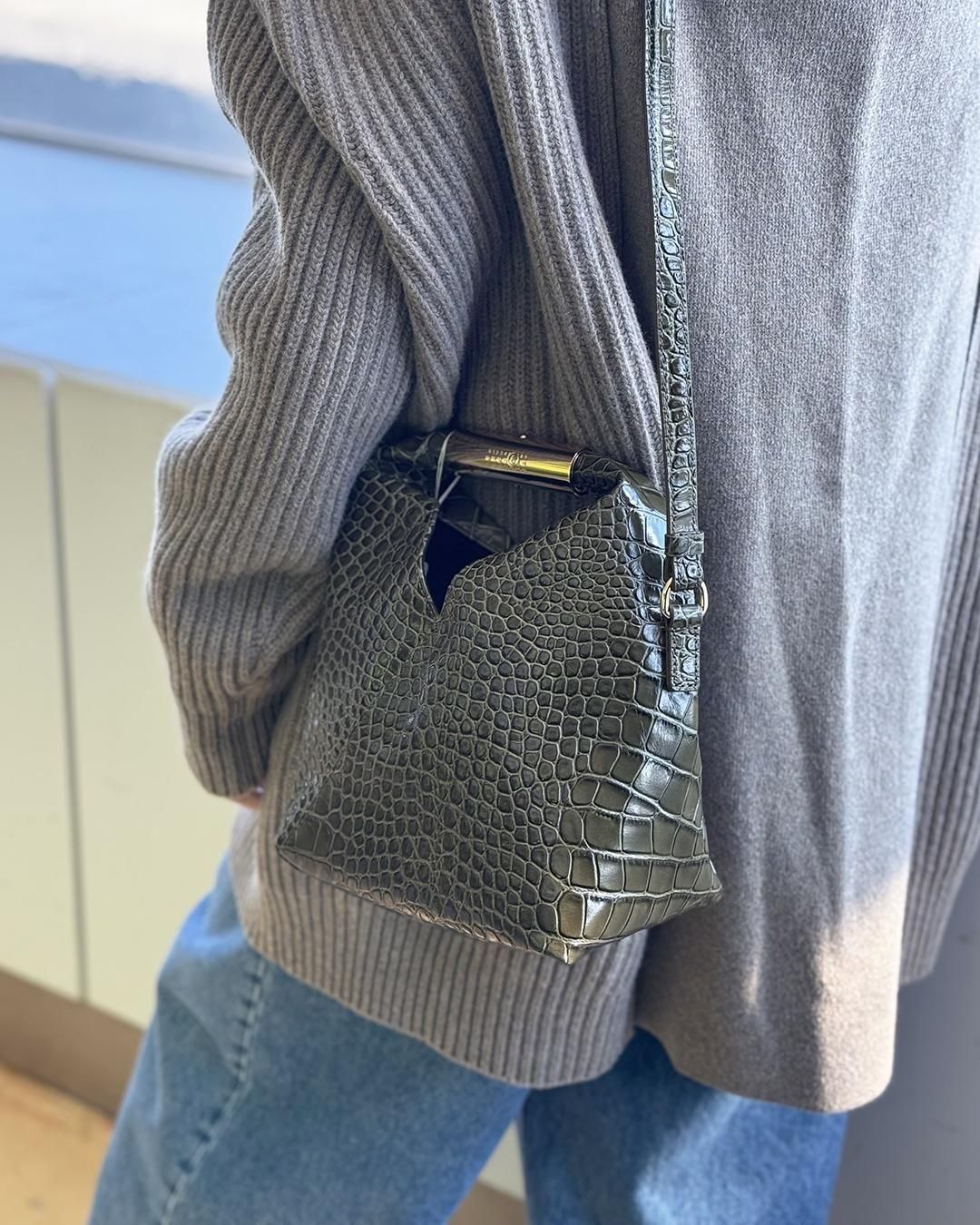 2024年春夏に初登場した、MM6を象徴するアクセサリー「ジャパニーズ」バッグの進化形。折り紙に着想を得た特徴的なフォルムを継承しつつ、構築的で新しい立体感を備えています。クロコ型押しのレザーを使用し、調節可能なストラップとハンドル部分の「ニューメリック」ロゴを配したデザインです。