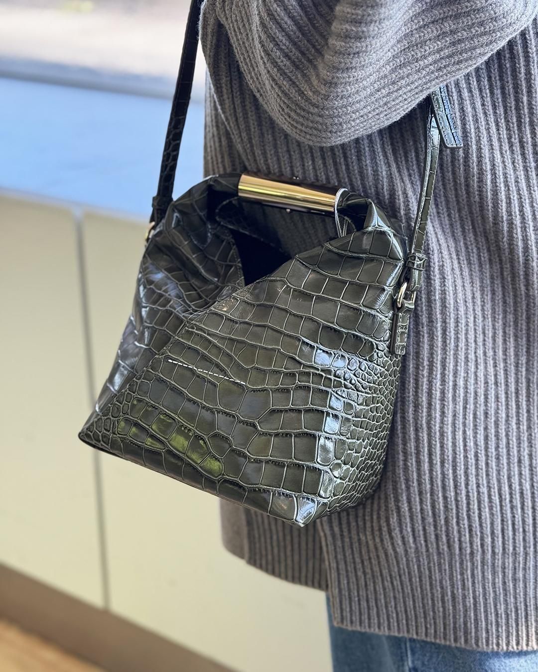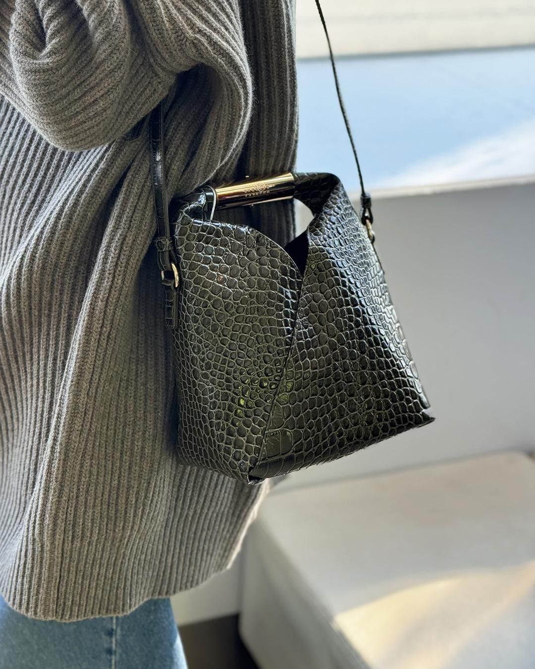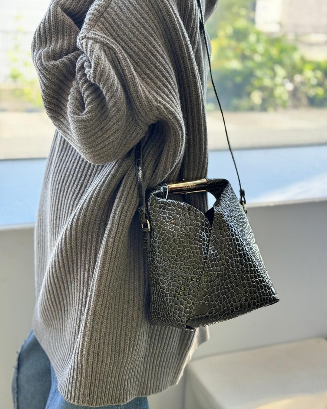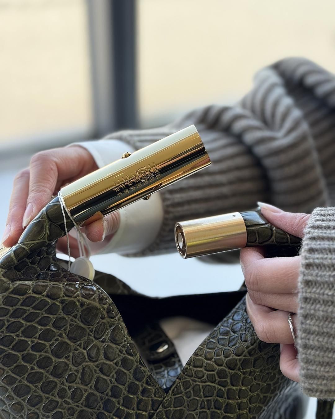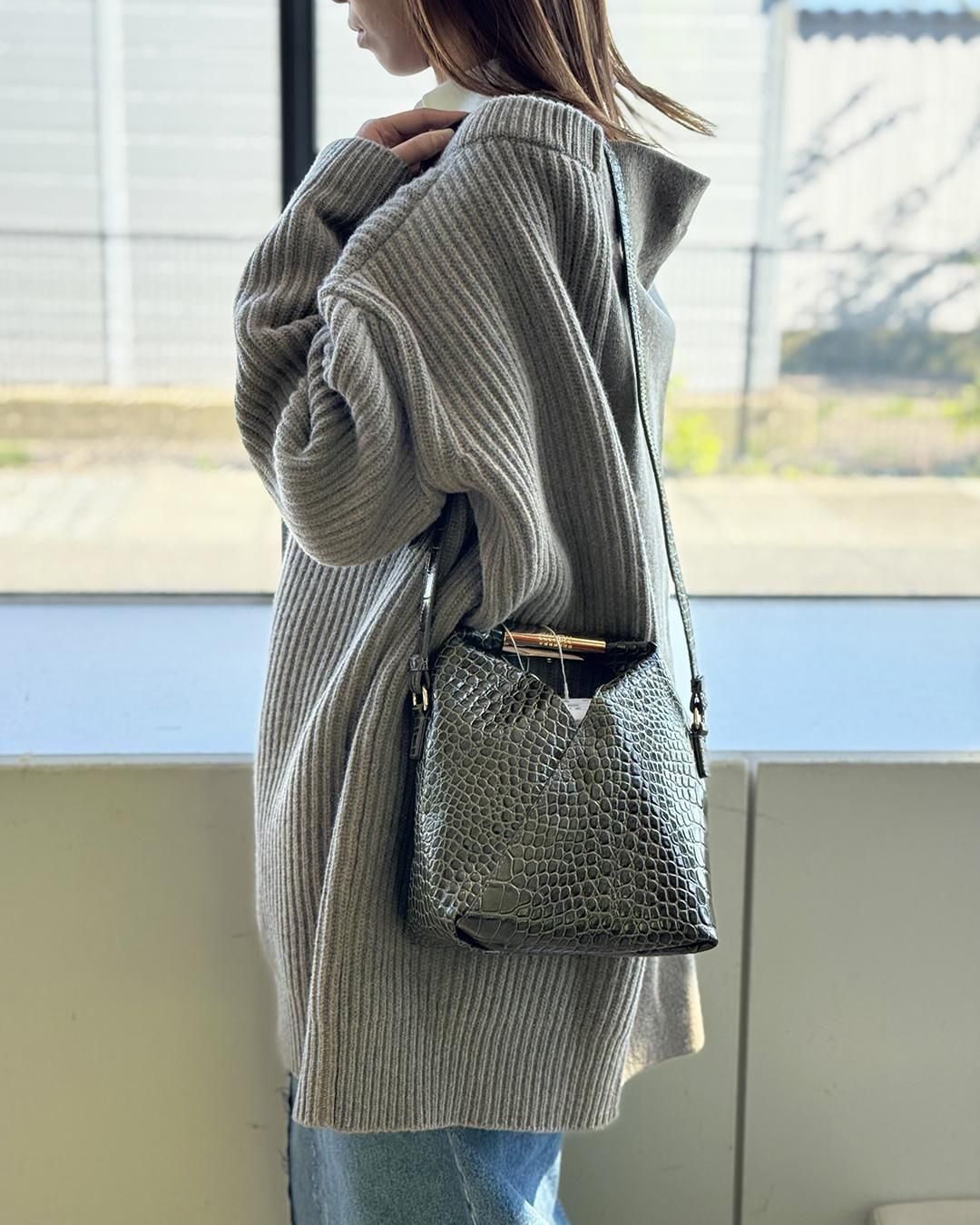 2024年春夏に初登場した、MM6を象徴するアクセサリー「ジャパニーズ」バッグの進化形。折り紙に着想を得た特徴的なフォルムを継承しつつ、構築的で新しい立体感を備えています。クロコ型押しのレザーを使用し、調節可能なストラップとハンドル部分の「ニューメリック」ロゴを配したデザインです。