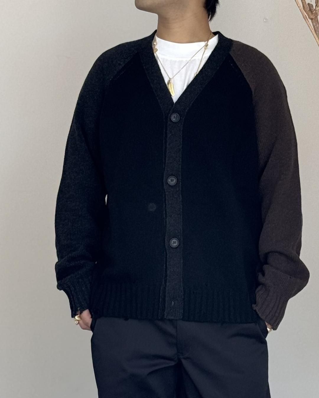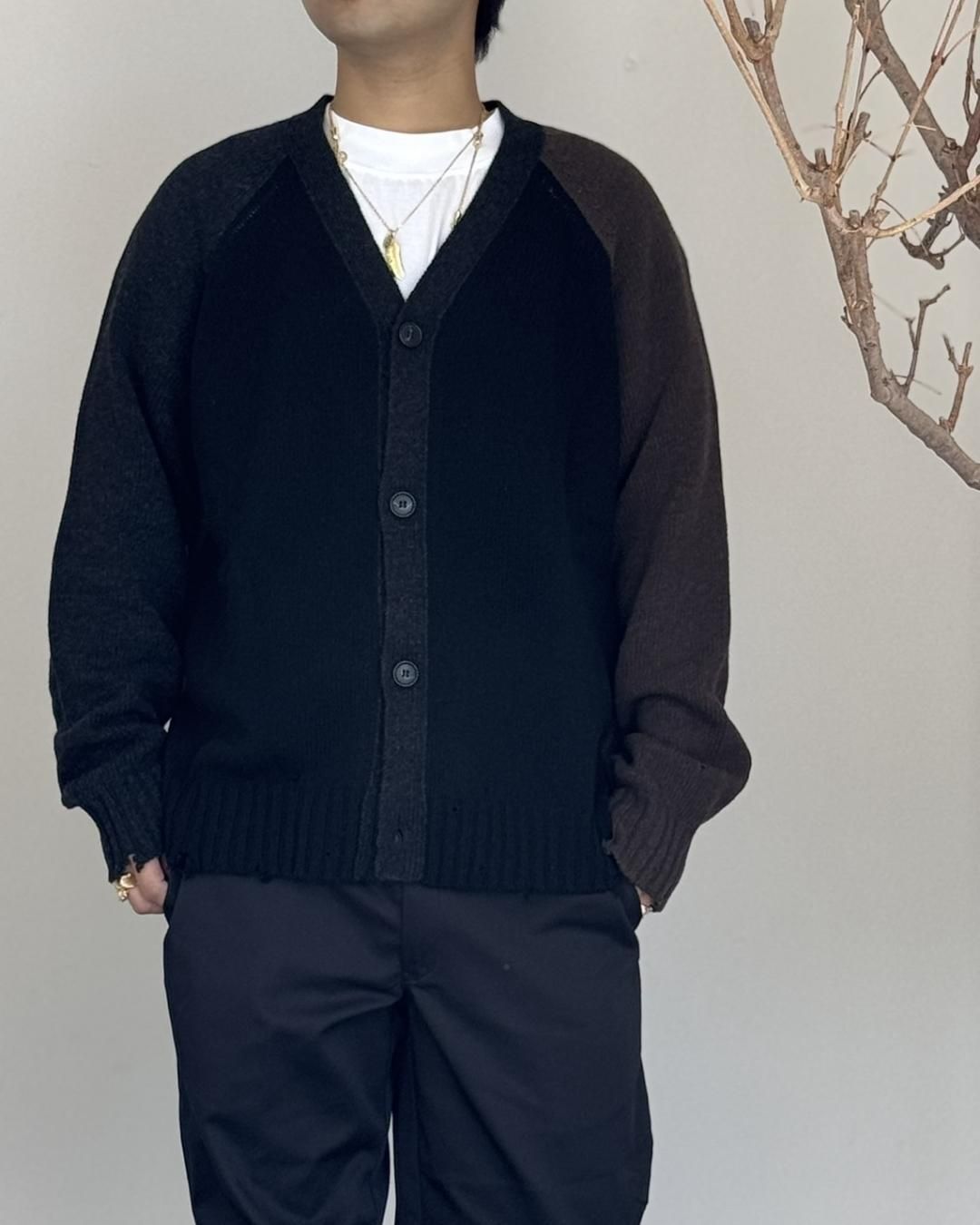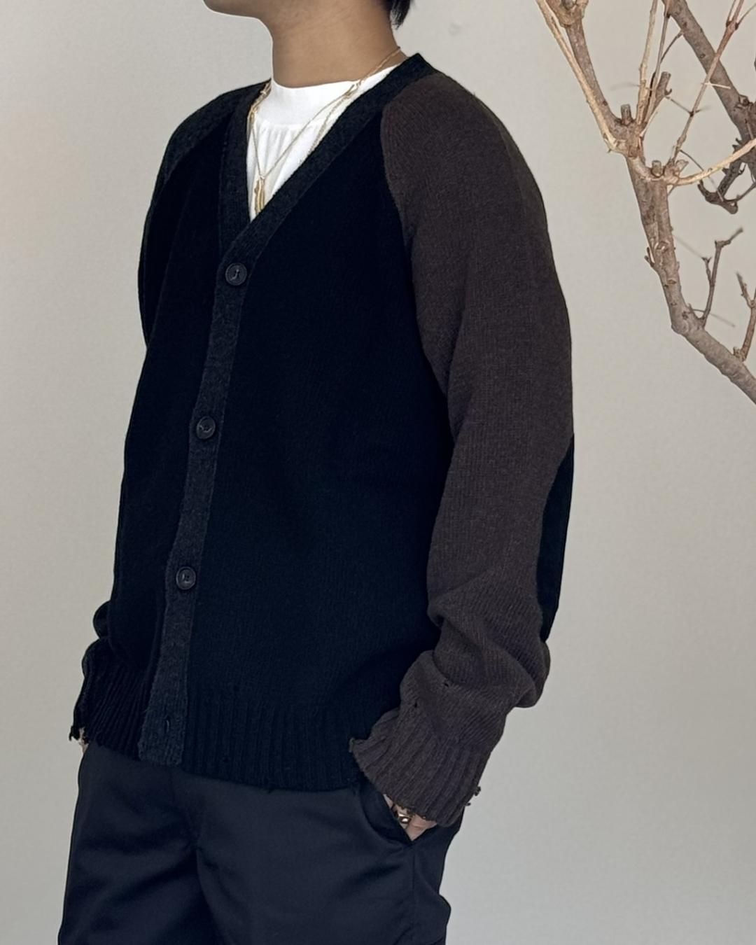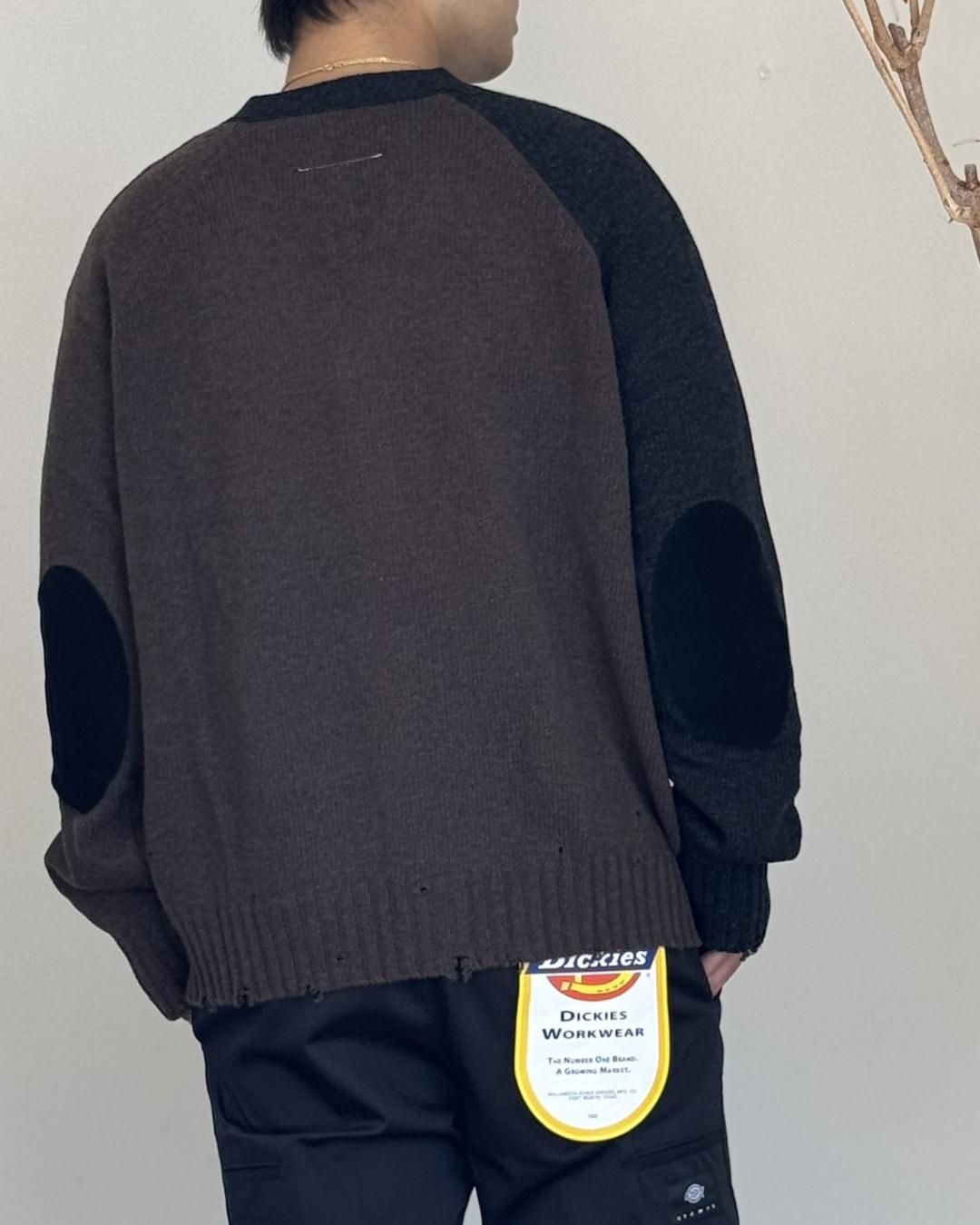 片袖だけコントラストカラーで仕上げられ、さりげなく脱構築的なアプローチが施された、バイカラーのカーディガン。フリンジ状の端や控えめなダメージ加工が、着古されたような反骨的雰囲気を醸し出し、オーバーサイズのスエードエルボーパッチで、ラフで個性的なデザインを引き立てています。バックには、さり気なくMM6を象徴する1本の白いステッチがあしらわれています。
