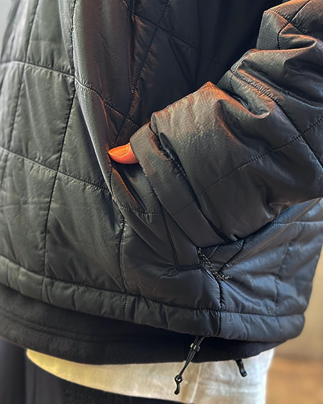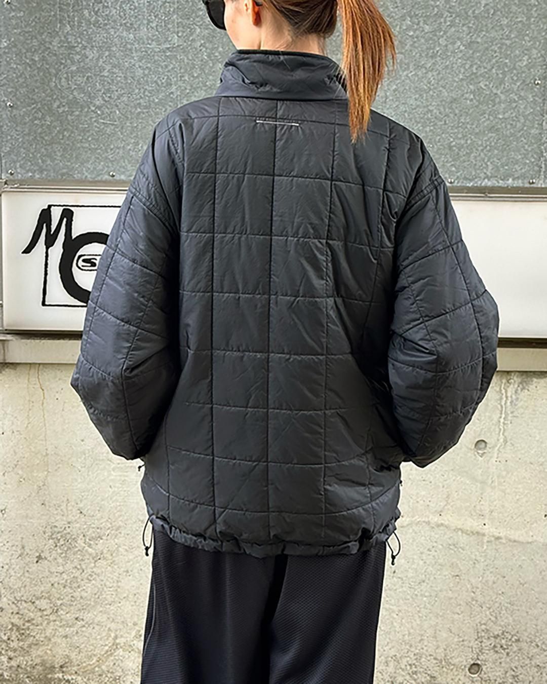 ひとつのアイテムにふたつの表情を持たせたリバーシブルインシュレイテッドジャケット。片面はMM6とSalomonのダブルアートワークをあしらったキルティング仕上げ、もう一方は軽やかでクリーンな質感に、さりげないポケットディテールを添えています。ファネルネック、伸縮性のある裾、ジップクロージャーを備え、あらゆるシーンに対応できるアダプタビリティを追求。バックにはメゾンのシグネチャーであるホワイトステッチを配し、揺るぎない信念をデザイン。