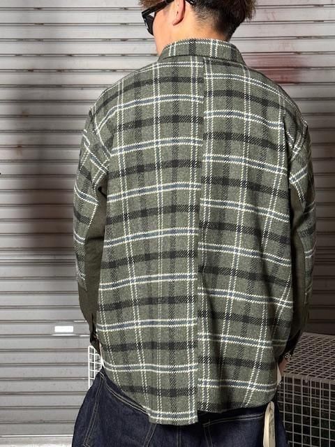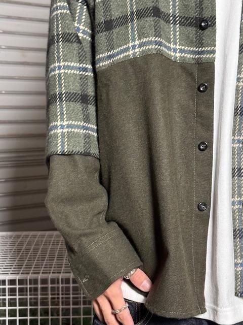 ・チェックフランネルと無地フランネル素材をパッチワーク調に切り替えたチェックフランネルシャツ。