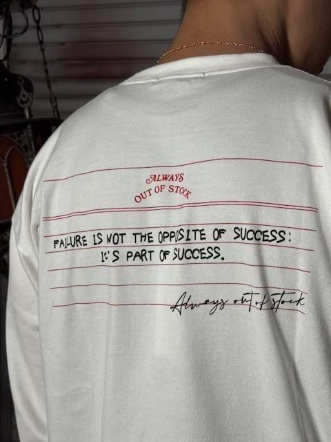 ・フロントには手書き調のALWAYS OUT OF STOCK、背面には「失敗は成功の反対ではない。成功の過程だ」というメッセージが手書き調で記されている。