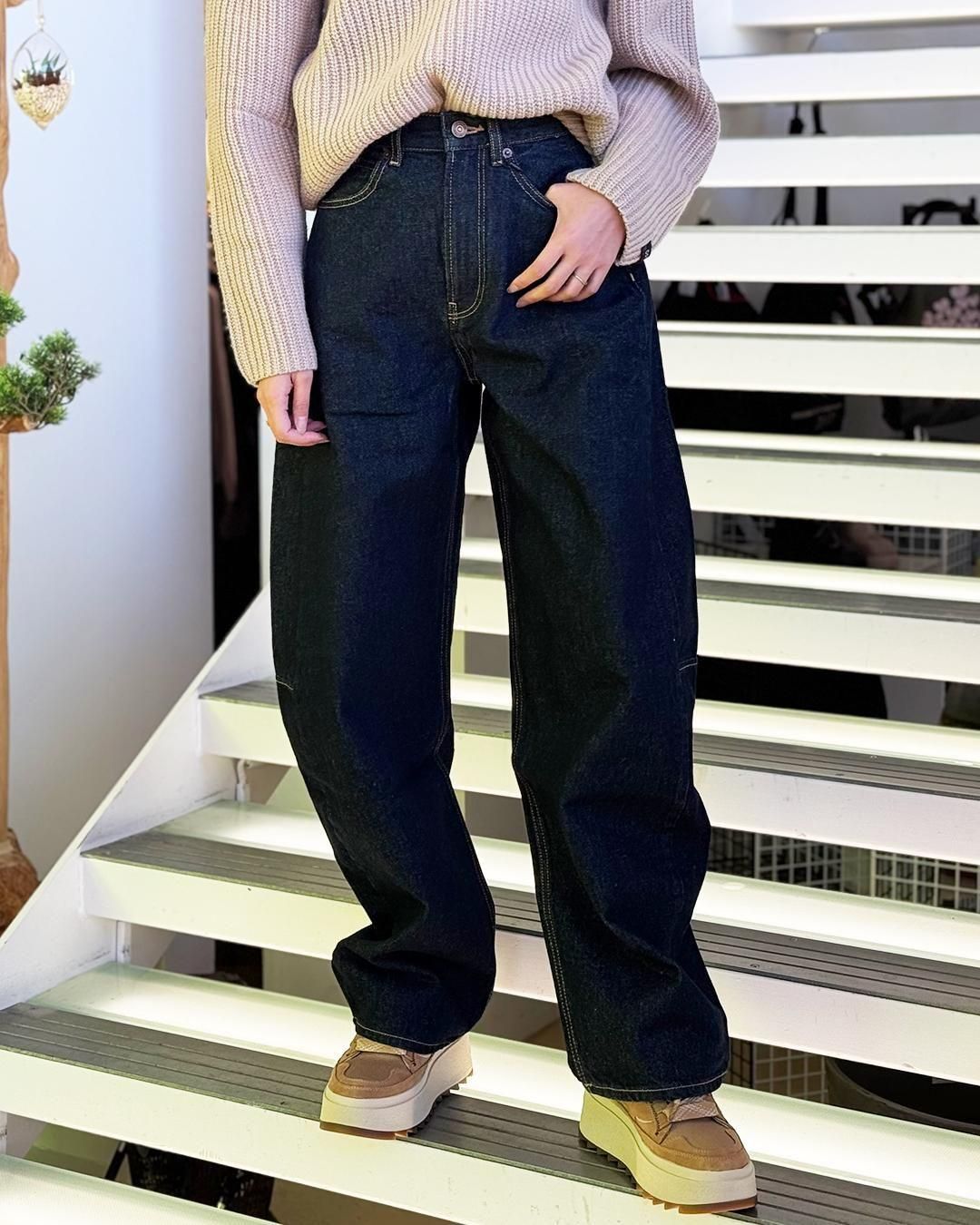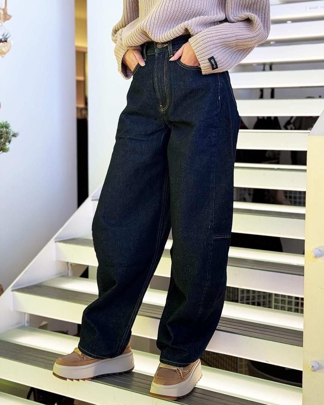 樽のような丸みのあるシルエットを特徴とするバレルジーンズ。ヒップや太ももはゆったりとさせ、カーブを描きながら細くなるデザインは、体型カバーとスタイルアップの丁度いいバランスを生み出します。裾が広がりすぎず、足元もすっきり。コットン100%でデニム本来の程よいハリと厚みを堪能できます。