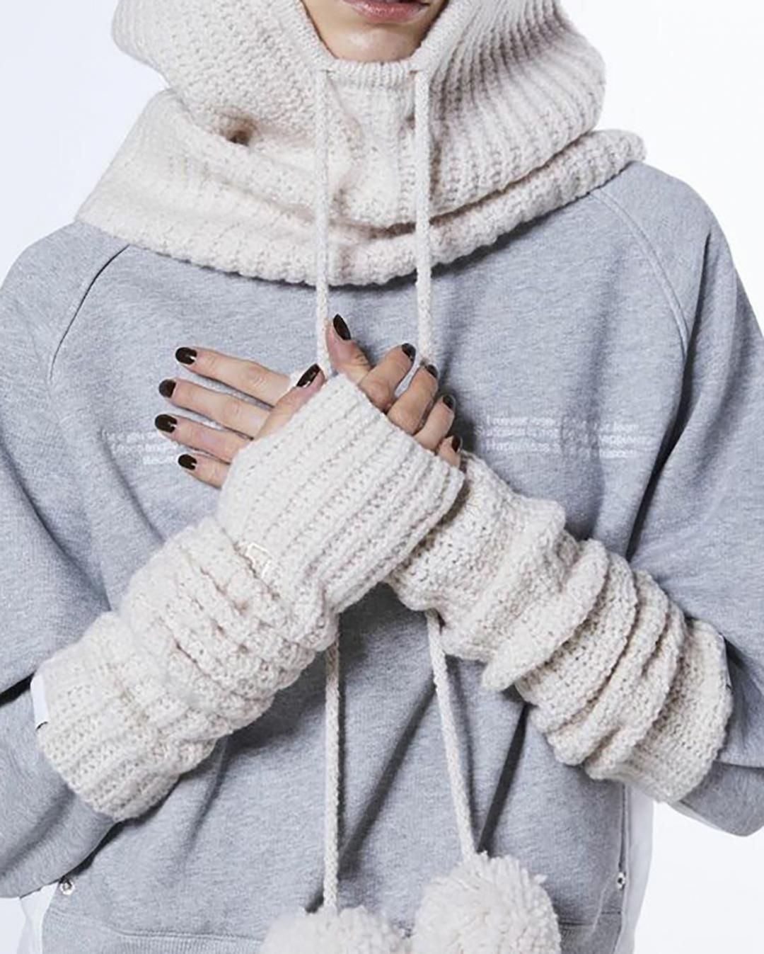 ボリューム感のある片畦編みで仕上げたアームウォーマー。指先が出るデザインで、スマホ操作や軽い作業も快適に行えます。カラーはコーディネートに合わせやすいオフホワイトとネイビーの2色展開。同素材のバラクラバ(型番:2500120254)と組み合わせれば、統一感のあるあたたかい冬のスタイリングが完成します。