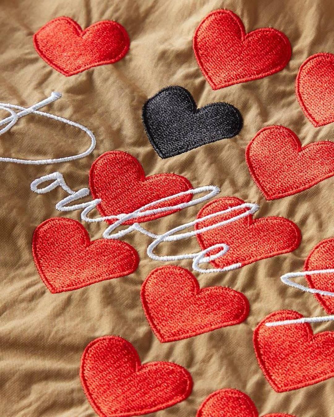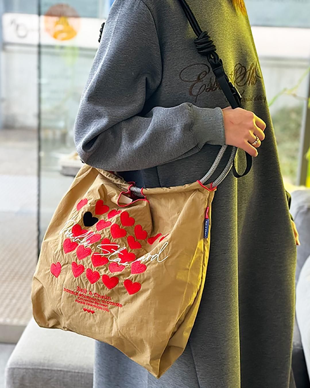 アウトドアな紐とタフな生地を使用したショッピングバッグ。フロントにはブランド文字とともに、キュートなハート刺繍を散りばめて遊び心をプラスしました。コンパクトながら必要なものがしっかり入るミニサイズで、デイリーのお出かけや旅行時のサブバッグとしても活躍。キャメルとブラックの2色展開で、スタイリングやシーンに合わせて選べます。
