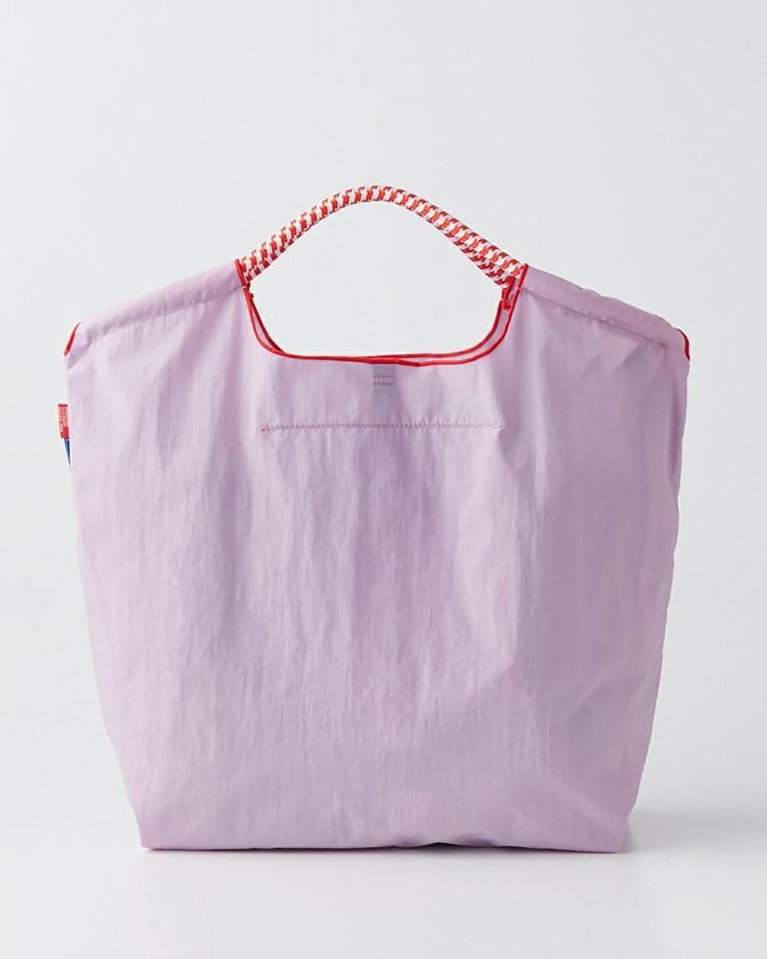 アウトドアテイストの紐とタフな生地を使用したショッピングバッグ。フロントには、ダブスタの人気キャラクター「ニジタロウ」をコーヒーショップ風のロゴでデザインし、遊び心のある仕上がりにしました。ラベンダーとサックスのポップなカラーリングが、スタイリングに明るさと抜け感をプラス。軽やかに持てるエコバッグながらも、ファッション性を兼ね備えたボール&チェーンらしいアイテムです。
