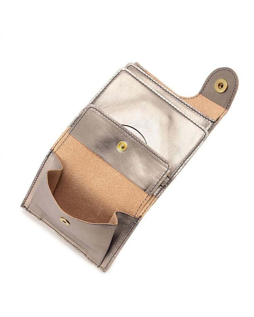 メタリックカラーのミニウォレット。フロントのブランドロゴの型押しがおしゃれなアクセント。コンパクトなサイズ感でミニマルなお出かけスタイルに最適。コンパクトながらもマチ付きのコインケース、カード入れ、セミオープンのお札入れで使い勝手も抜群です。