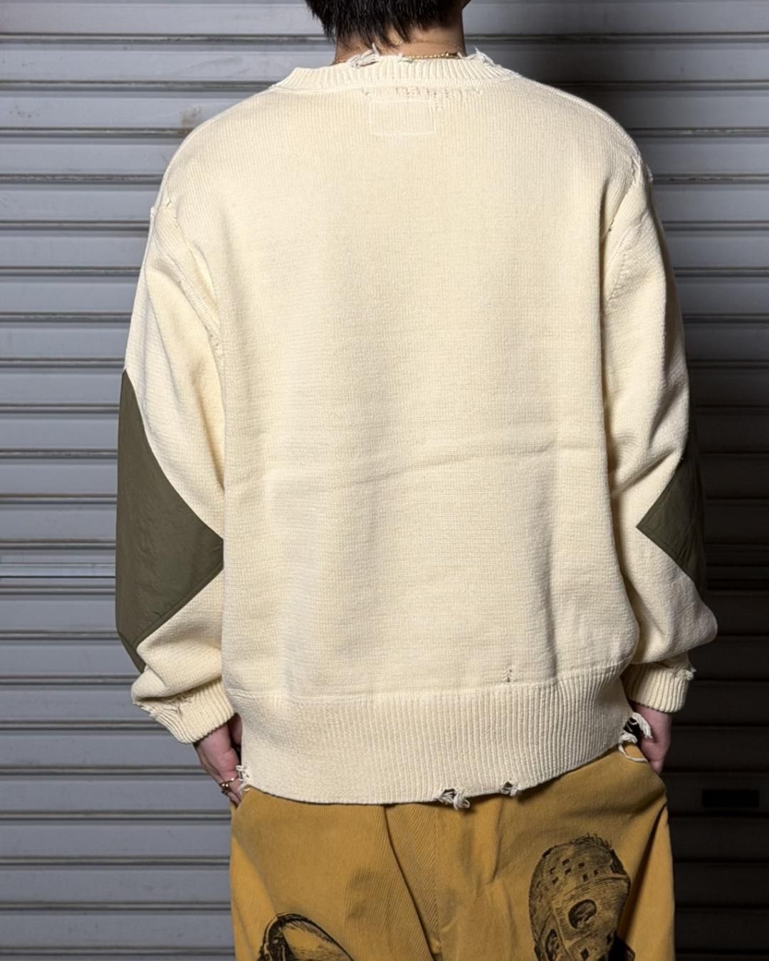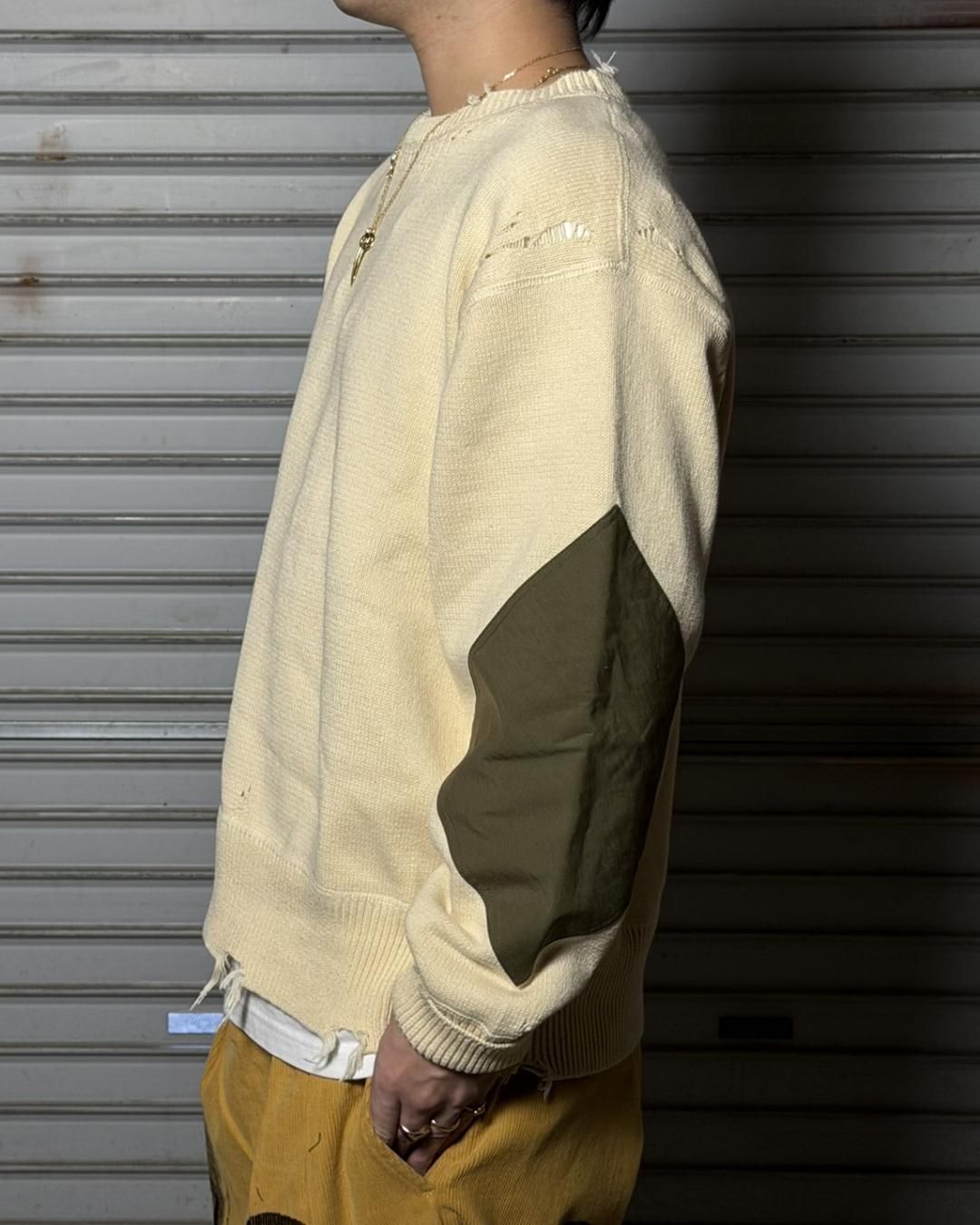 強撚のリサイクルコットン糸を使用し、ダメージ箇所は編みで再現した高度な編立技術を使用し、NEXUSVII.が以前から製作してきたオリジナルデザインのダイヤ型肘当てを配したクルーネックニットです。