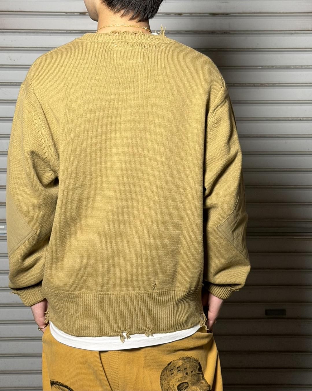 強撚のリサイクルコットン糸を使用し、ダメージ箇所は編みで再現した高度な編立技術を使用し、NEXUSVII.が以前から製作してきたオリジナルデザインのダイヤ型肘当てを配したクルーネックニットです。