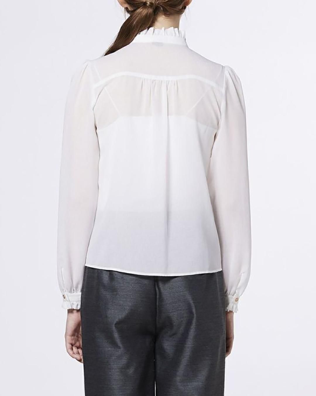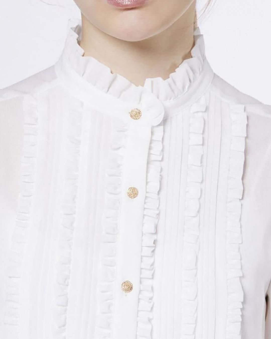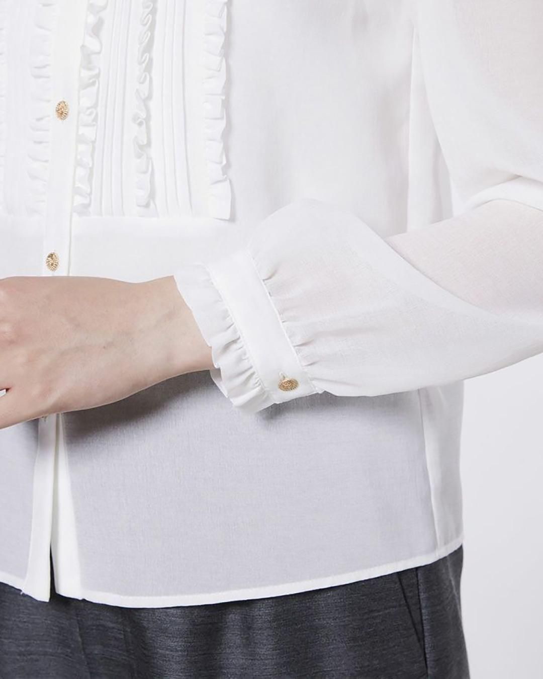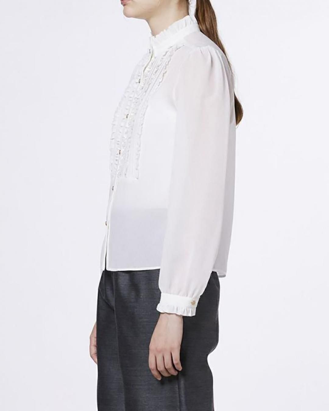 胸元の繊細なフリルが華やかさを添えるブラウス。透け感のあるシフォン素材で程よい肌見せを叶え、シフォンならではの美しい落ち感が女性らしさを引き立てます。あえてデニムのセットアップやスラックスと合わせれば、ハンサムライクな着こなしに。デイリーからオケージョンまで幅広いシーンで活躍します。