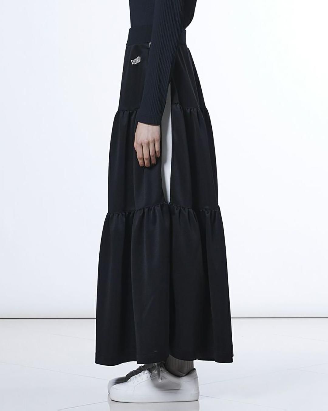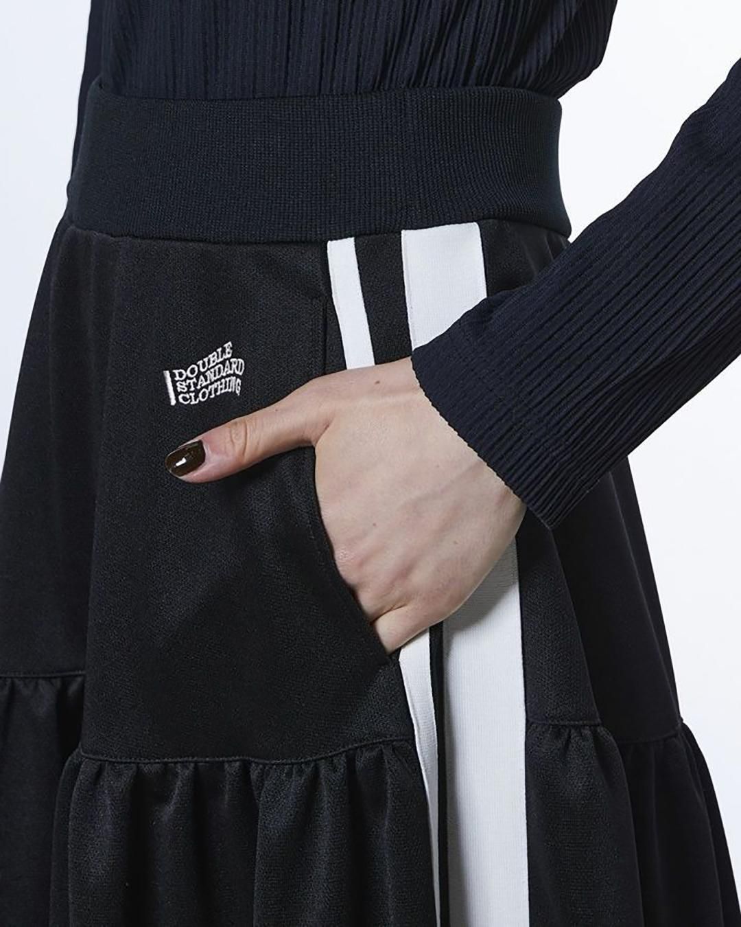 トラックジャージのディテールを取り入れたロングスカート。ボリュームのあるティアードデザインが、スポーティーな中にも女性らしい華やかさを添えてくれます。ポリエステルのジャージ素材を使用し、吸汗性・速乾性に優れた快適な着心地を実現。コンパクトなトップスを合わせれば、バランスの取れたスタイリッシュなコーディネートが完成します。